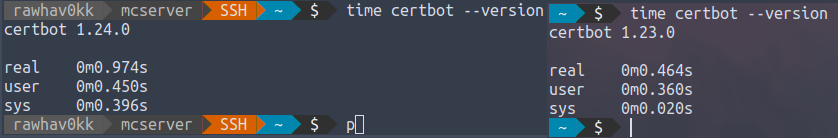 On the left you can see my server running certbot with snaps and on the right and my artix pc running certbot from arch repos. Look how it takes almost twice as much to run snaps package. I am aware that this test is hardly precise, since its 2 different distros, hardware setups, etc. Though this is still a huge difference. Imagine that I have to restart node 15 times a day when I am working on something, Not counting the script initiation time. It is terrible.